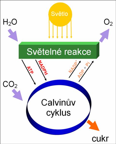 Produktem chemického procesu fotosyntézy jsou cukry C6H12O6 glukóza a kyslík O2